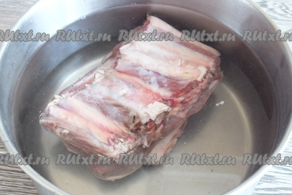 Мясо с косточкой (я готовила говяжьи рёбрышки) выложите в кастрюлю, в которой будете варить суп, влейте 2,5-2,8 литра холодной воды, поставьте на огонь, после закипания снимите пену и уменьшите огонь. Варите до готовности мяса (говяжьи рёбрышки будут готовы через 2,5 часа, если варите бульон из свинины на кости, тогда она будет готова часа через 1,5, если варите кусочки курицы, то мясо будет готово минут через 40-50).