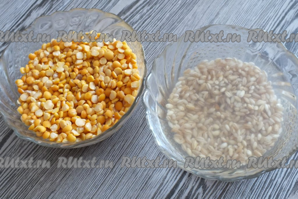 С вечера подготовьте горох и перловку. Горох и перловку промойте по отдельности. Выложите горох и перловку в разные ёмкости, полностью залейте крупы холодной водой и оставьте на ночь. Утром воду, в которой замачивались крупы, слейте, а горох и перловку хорошо промойте.