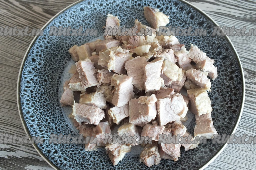 По истечении времени достаньте мясо из бульона, охладите, отделите от костей, а затем нарежьте на небольшие кусочки.