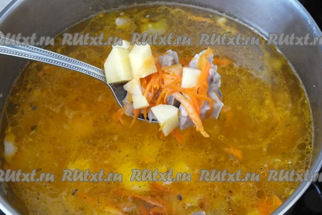 Кастрюлю с процеженным бульоном поставьте на огонь. В закипевший бульон выложите картошку, обжаренные овощи и нарезанное мясо, посолите, дайте закипеть, а затем варите на небольшом огне до полуготовности картошки (минут 10).