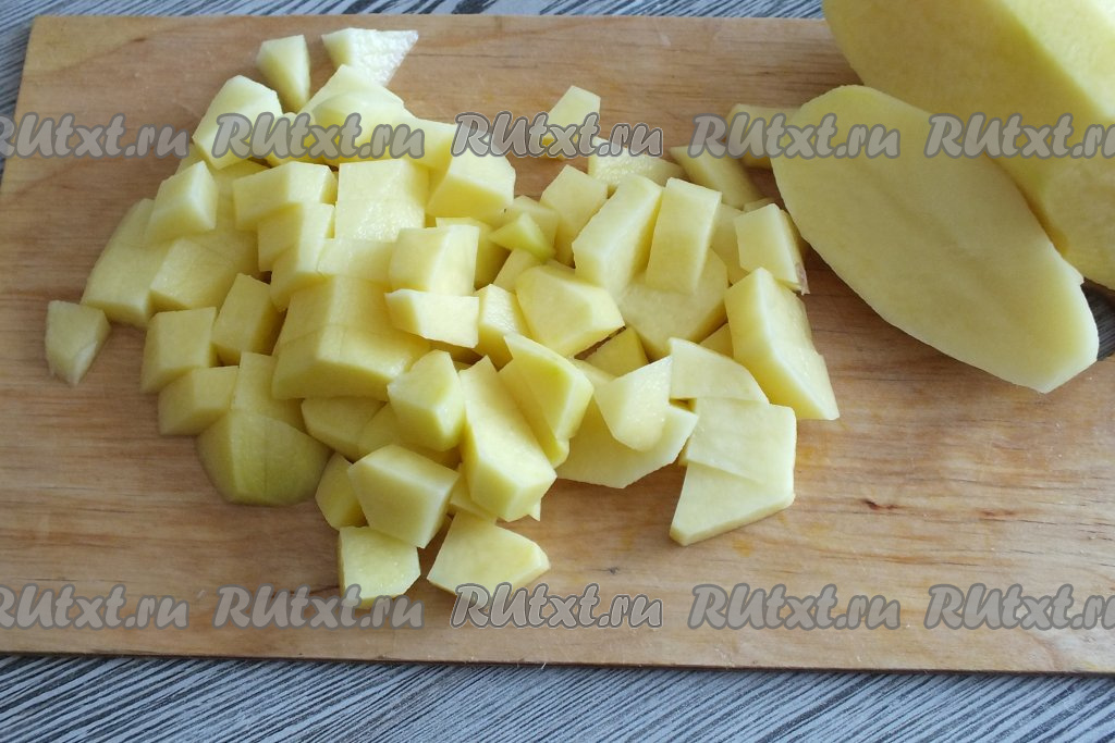 Очищенные картошины нарежьте на небольшие кубики.