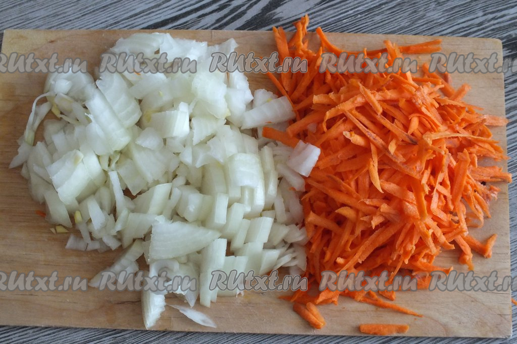 Лук, картошку и морковь очистите. Луковицу нарежьте на небольшие кубики. Натрите морковку на крупной тёрке.