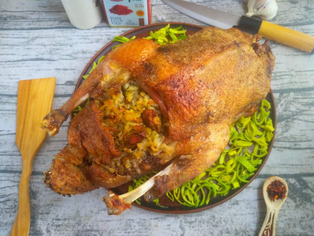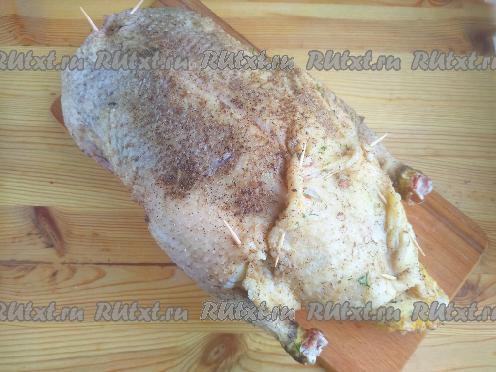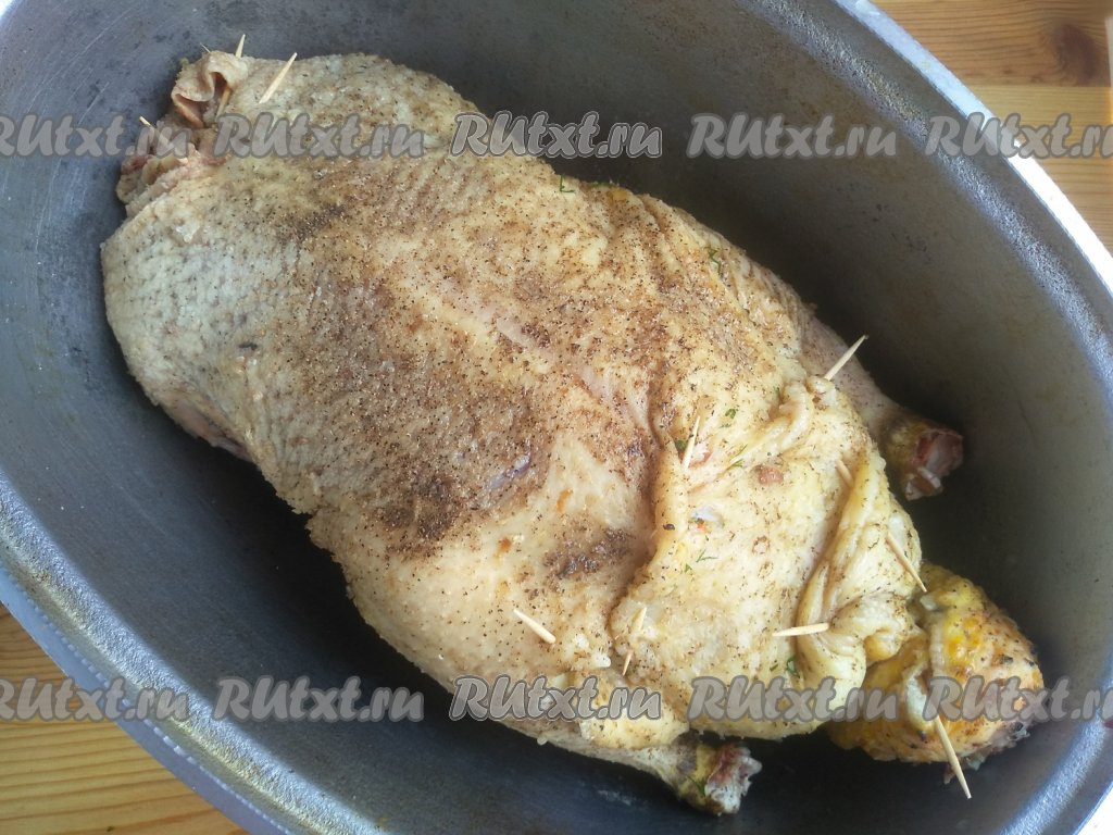 Внутрь утки выложить подготовленную начинку из риса и овощей. Места разреза фаршированной утки скрепить зубочистками, полностью закрывая начинку (как на фото). Кожу на шее вывернуть внутрь, также скрепить зубочисткой.