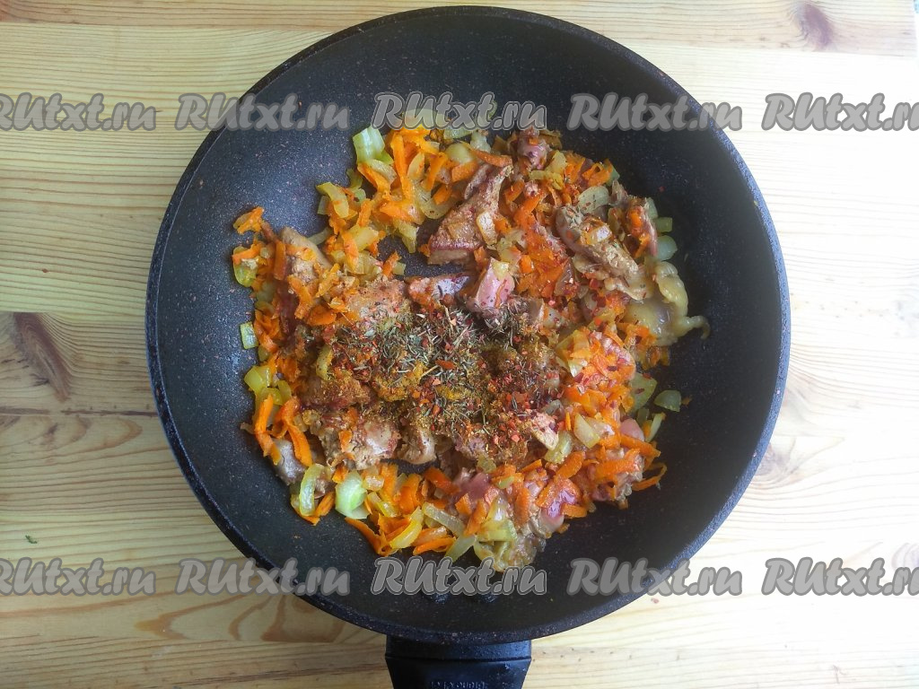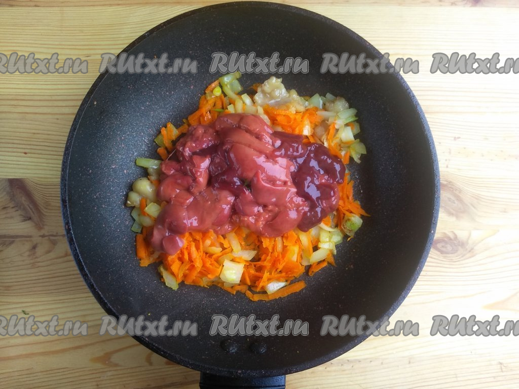 Печень и сердце нарезать на кубики и выложить в сковороду к морковке с луком. Обжаривать в течение 3-5 минут на среднем огне, периодически помешивая.
