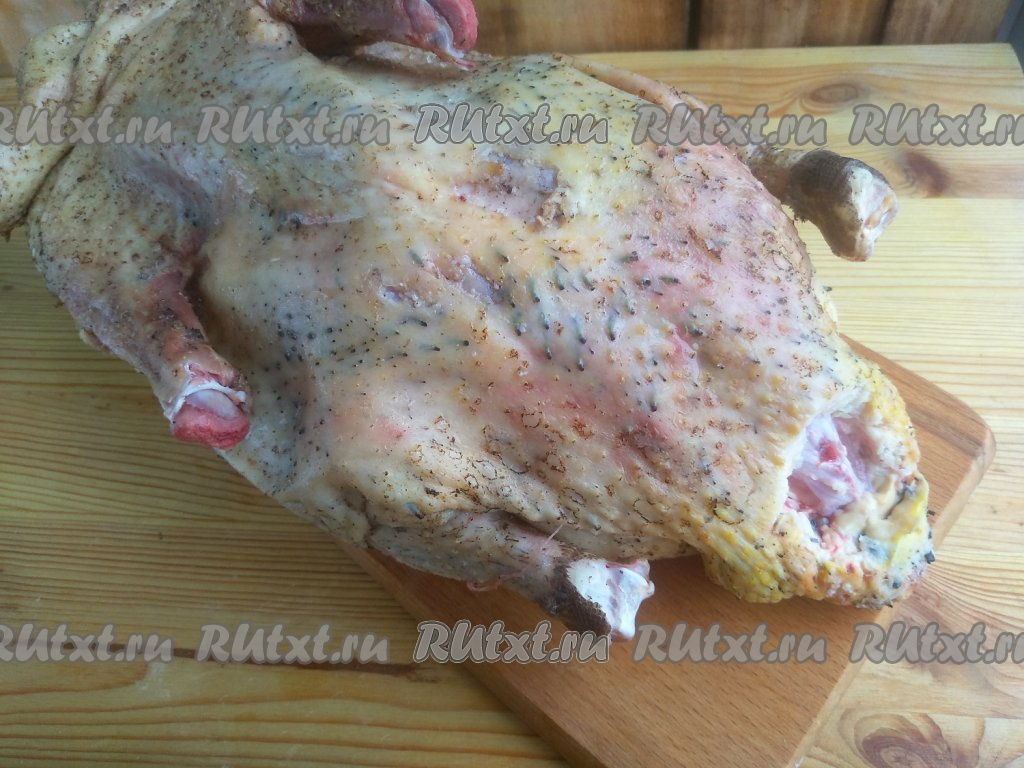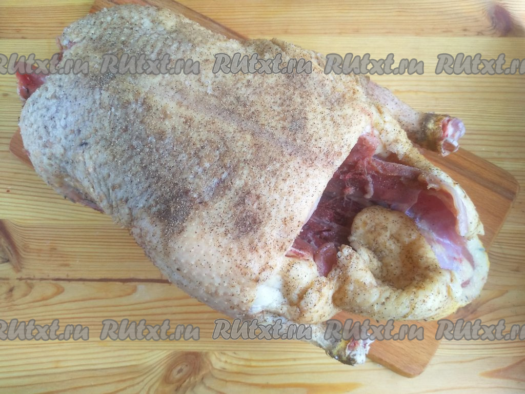 Достать жир из брюшка, он пригодится в начинку. Утку натереть внутри и снаружи солью и молотым чёрным перцем, оставить на 1 час при комнатной температуре.