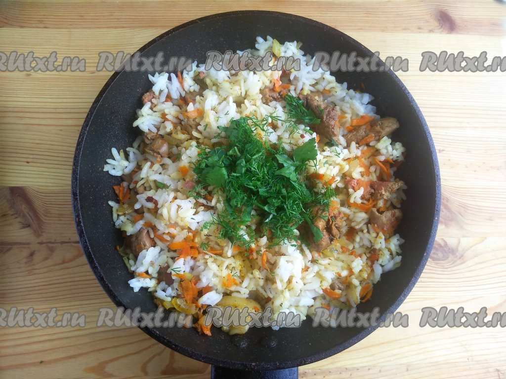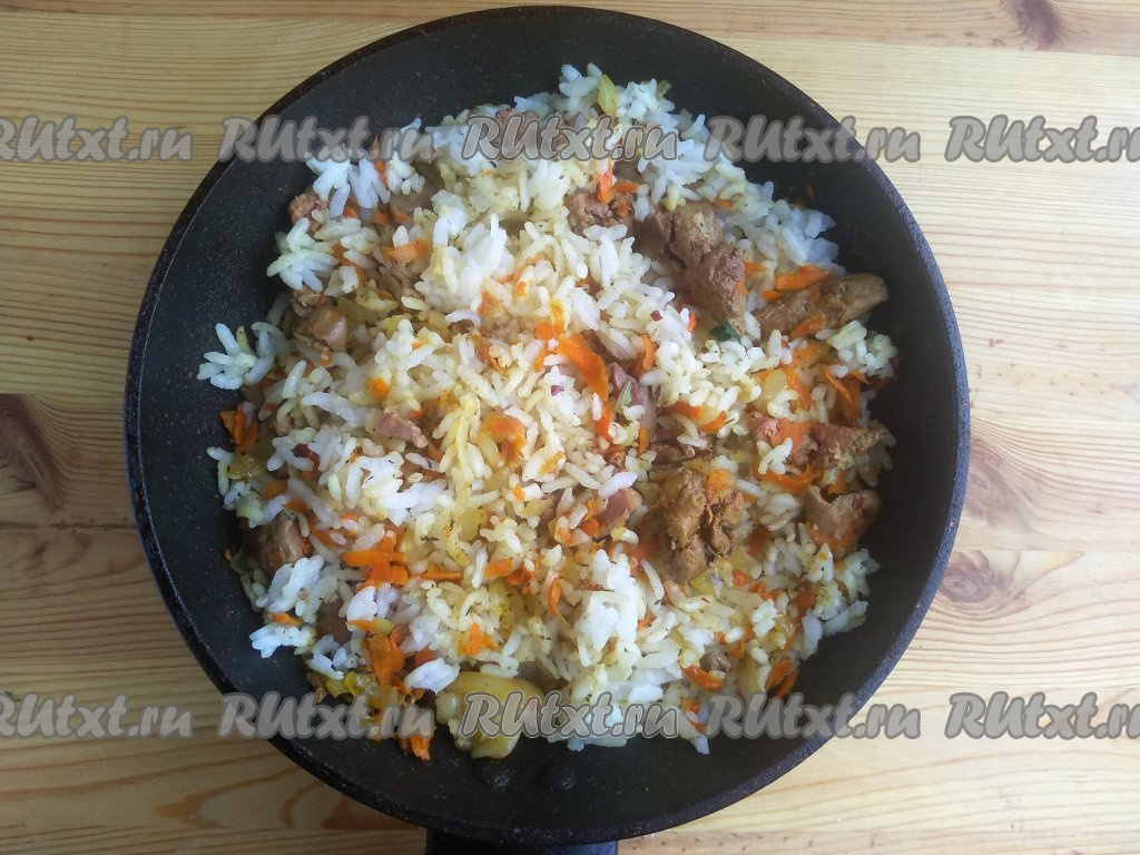 Рис хорошо промыть, дать стечь лишней жидкости, а затем выложить его в кастрюлю, залить 270 мл чистой холодной воды, поставить на огонь, дождаться закипания, а после этого варить на среднем огне до полуготовности и выпаривания жидкости (ориентировочно, понадобится около 10 минут). Затем переложить рис в сковороду с овощами и потрохами, перемешать, снять с огня, дать остыть и начинка для фарширования утки готова.