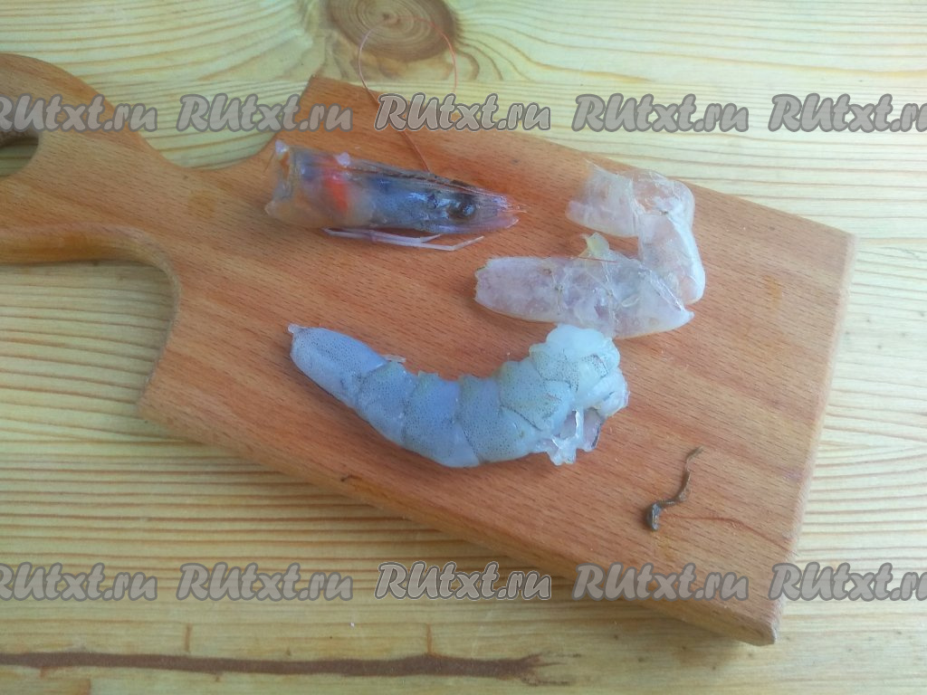 У каждой креветки отделить голову, она нам не понадобится. Снять панцирь, начиная с головы и до хвоста, затем вытянуть тонкую кишечную ниточку, которая располагается со стороны спинки.