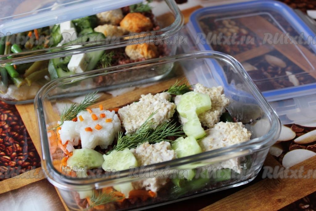 Для взрослой порции бенто ланча на красный рис уложите куриные фрикадельки, а на белый рис - овощи, добавьте огурец, т.е. у меня обрезки огурца, кубики феты и зелень.