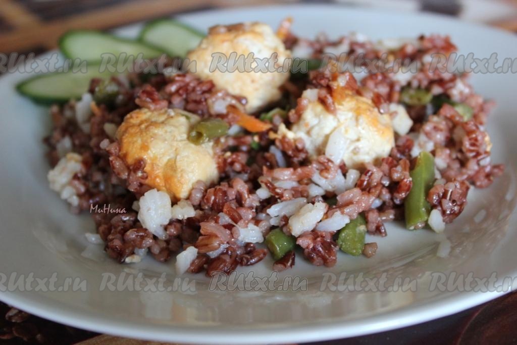 Для домашнего варианта обеда соедините оба риса и фрикадельки с овощами, перемешайте их и разложите по порциям.