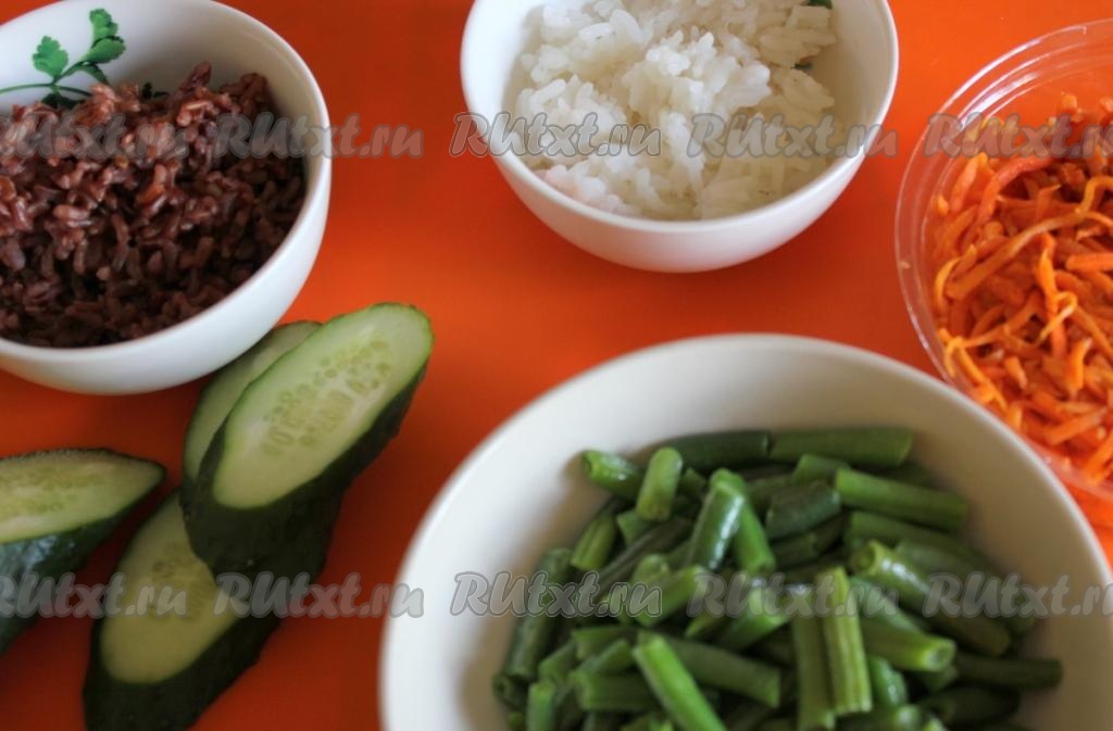 Положите фигурки в контейнер к красному рису, добавьте овощи: фасоль, морковь по-корейски и свежую зелень.