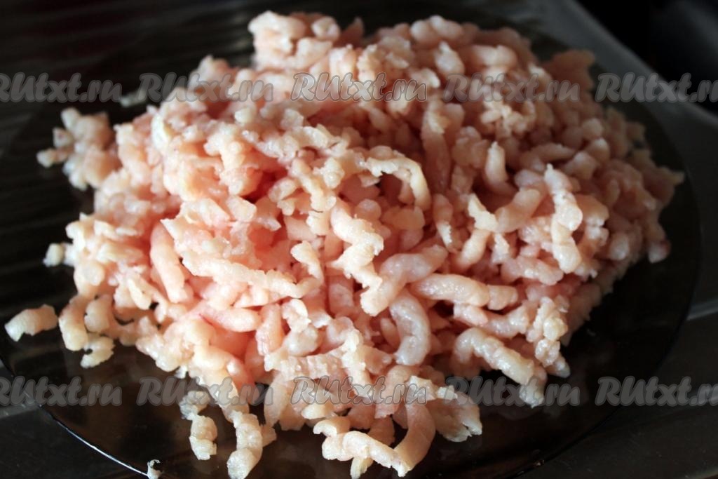 Приготовьте при помощи мясорубки из куриных грудок фарш, посолите его по вкусу.