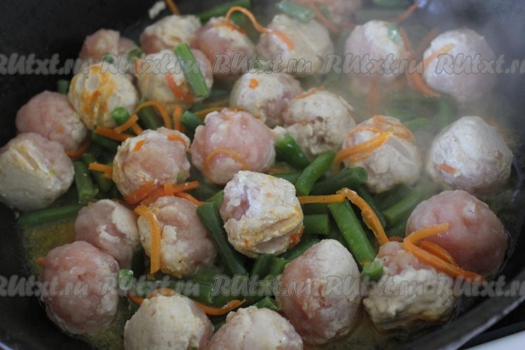 Из остального фарша сформируйте круглые фрикадельки, обжарьте их на растительном масле и потушите их до готовности вместе с морковью по-корейски и стручковой фасолью, которую предварительно ополосните в воде для удаления ледяной глазури.
