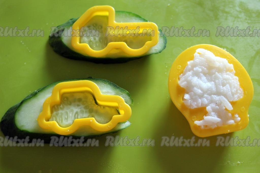 Деткам будет интересно, если из белого риса сформировать фигурку, а из огурца и запеченного куриного фарша формочками вырезать какие-либо фигурки.