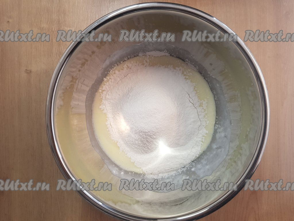 Затем, всыпав разрыхлитель и просеянную муку, перемешать тесто венчиком до однородности.