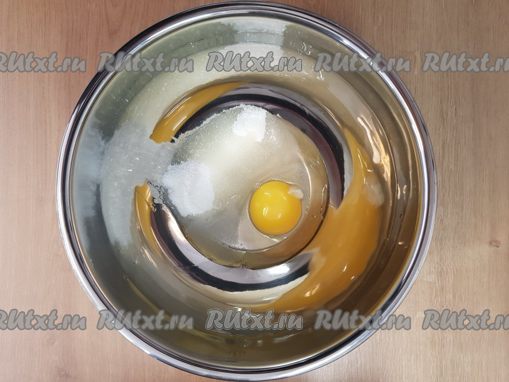 Разбить в достаточно глубокую миску яйцо, всыпать сахар и щепотку соли, влить подсолнечное масло.