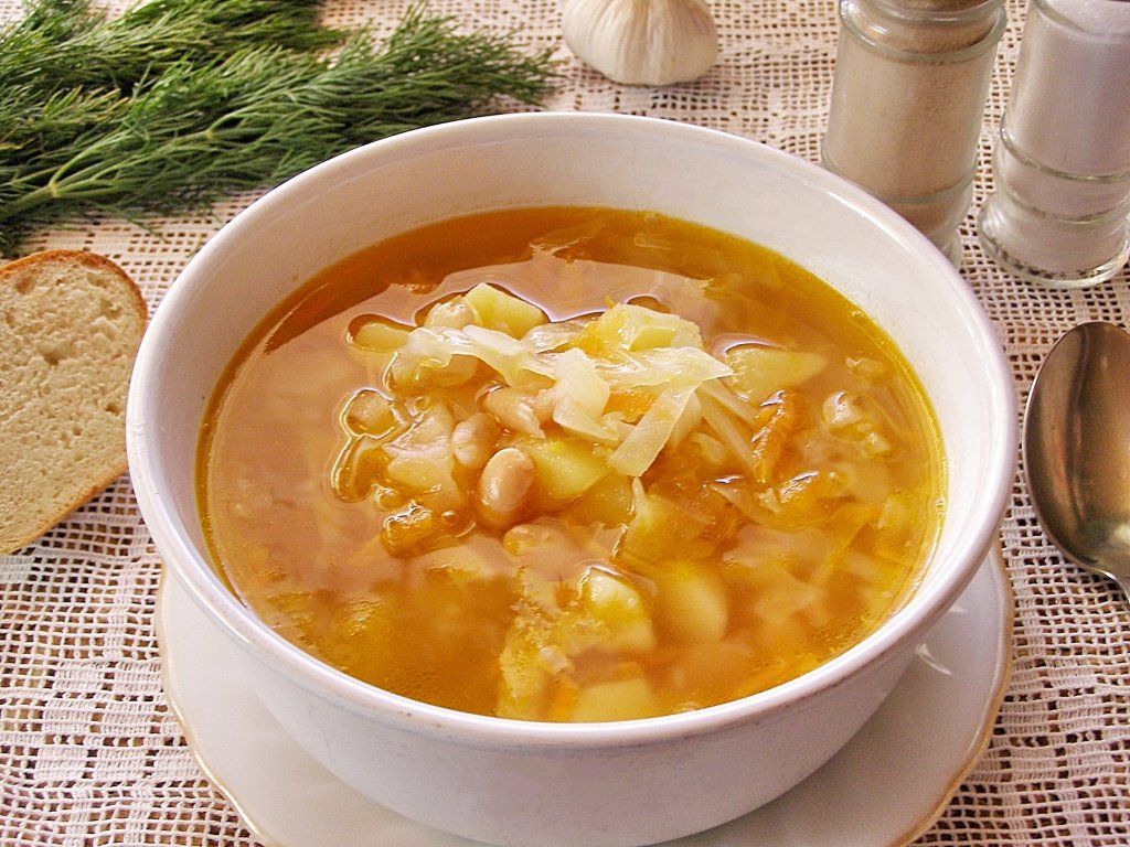 Когда картофель сварится, вынимаем из кастрюли лавровые листья, веточки и коренья (если вы их добавляли), кладём в кастрюлю с картофелем нарезанную капусту, сразу добавляем обжаренные лук с морковью, консервированную фасоль. При необходимости, можно долить немного горячей кипячёной воды и посолить по вкусу.