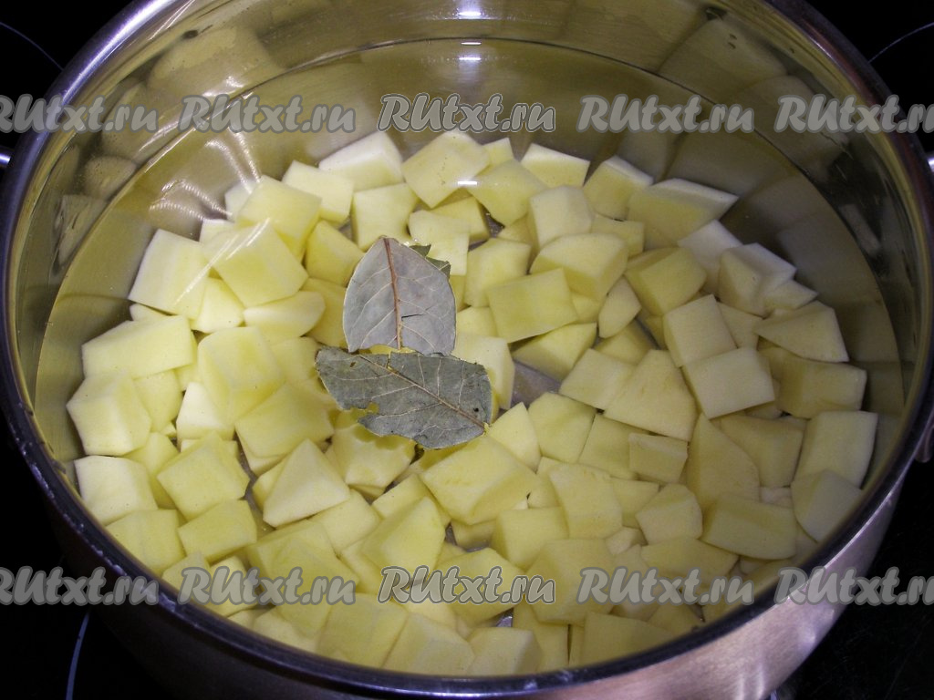Перекладываем картофель в кастрюлю, в которой будут вариться щи, заливаем 2 литрами свежей холодной воды, добавляем соль и лавровые листья. По желанию, можно положить в воду с картофелем стебли укропа, очищенный корень петрушки, а также горошинки чёрного и душистого перцев. На сильном огне доводим воду до кипения, затем огонь уменьшаем и варим картофель минут 15-20 (до мягкости).