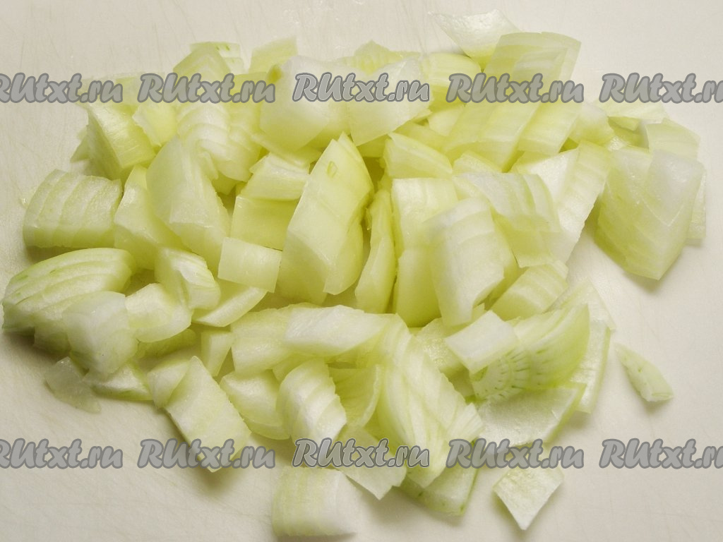 Пока варится картофель, приготовим зажарку для щей, для этого очищенную луковицу нарезаем кубиками.