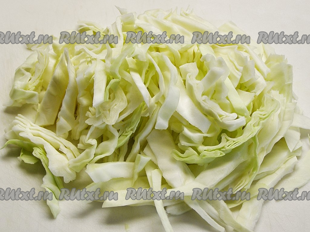 С капусты удаляем верхние повреждённые листья и шинкуем её полосочками толщиной около 5 мм.