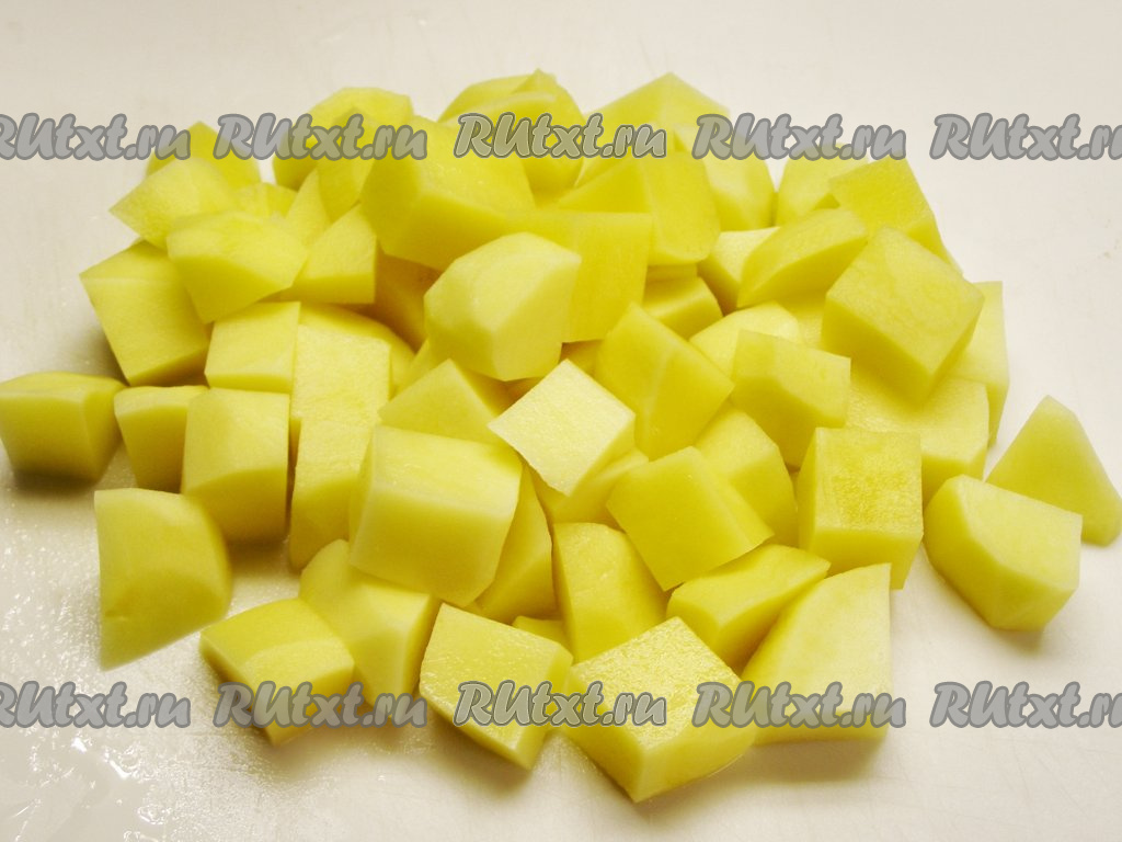 Картофель хорошо моем, очищаем от кожуры и нарезаем на некрупные кубики (или брусочки). Кладём нарезанную картошку в холодную воду и несколько раз промываем.