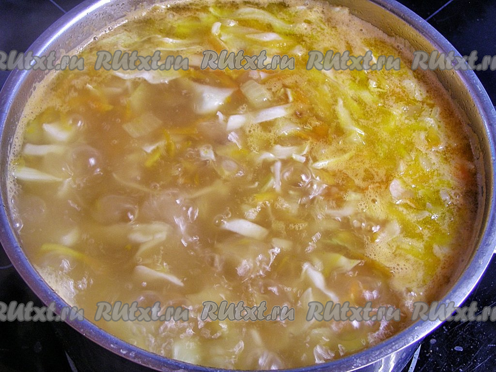Доводим щи до кипения. Если вы готовите с молодой капустой, то после закипания варим, примерно, 2 минуты, если у вас старая капуста, то после закипания варим минут 7, после чего убираем кастрюлю с огня и даём настояться минут 10 под крышкой.