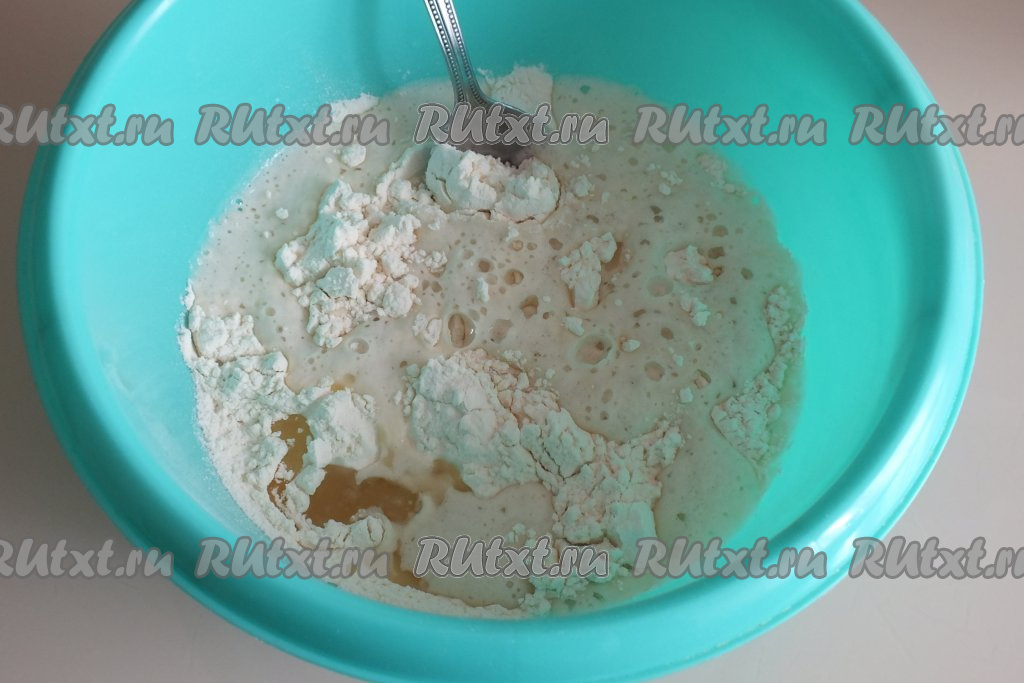 В достаточно объёмную миску, удобную для замешивания теста, просейте муку, добавьте запенившуюся (активировавшуюся) дрожжевую смесь, перемешайте ложкой.