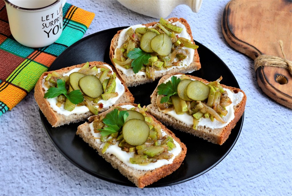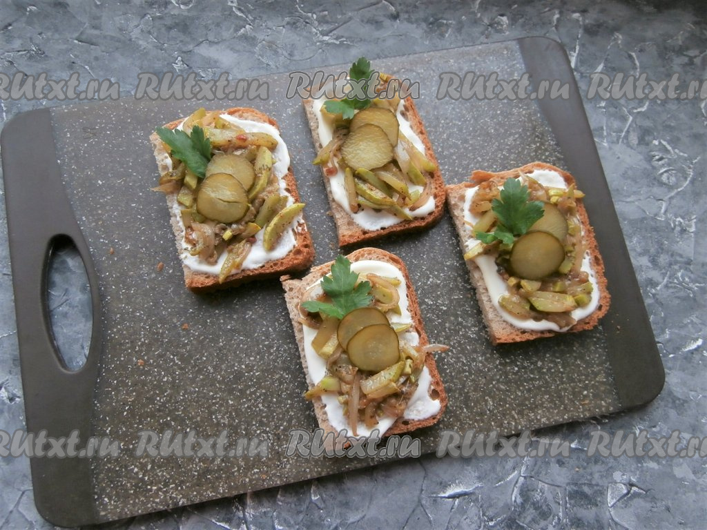 Украсить бутерброды, по желанию, кружочками маринованного огурца и зеленью петрушки.