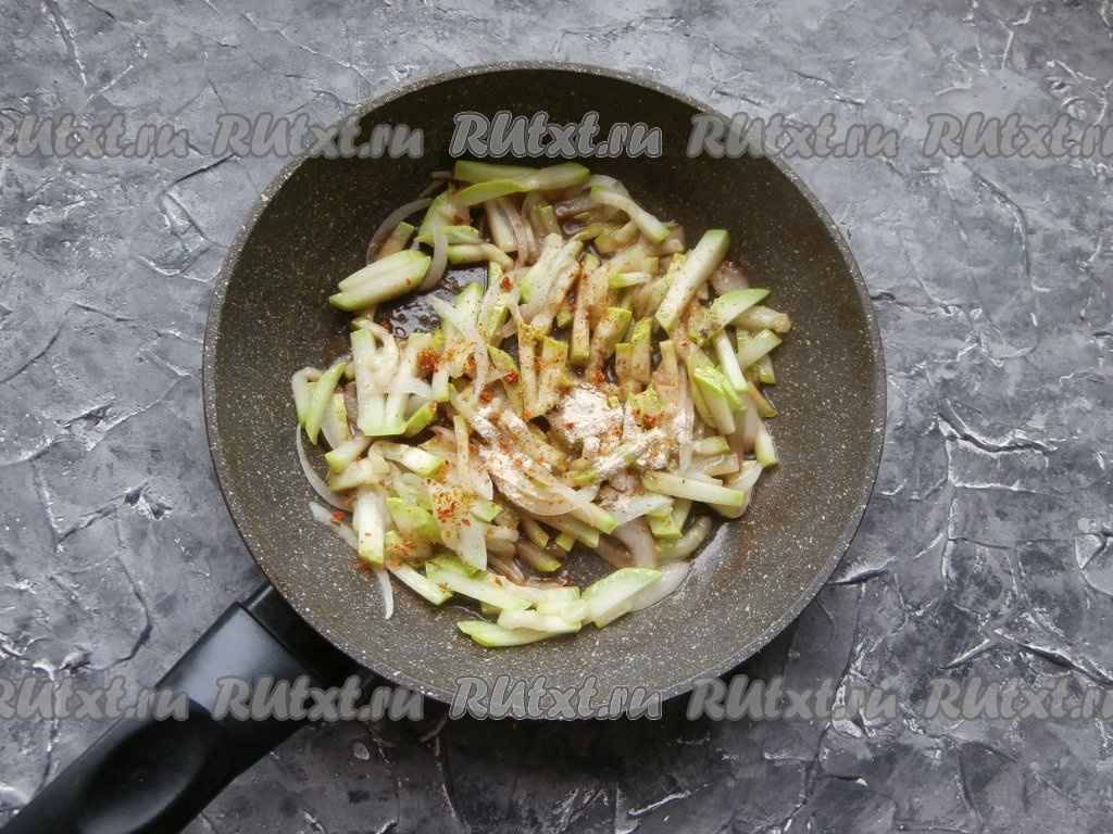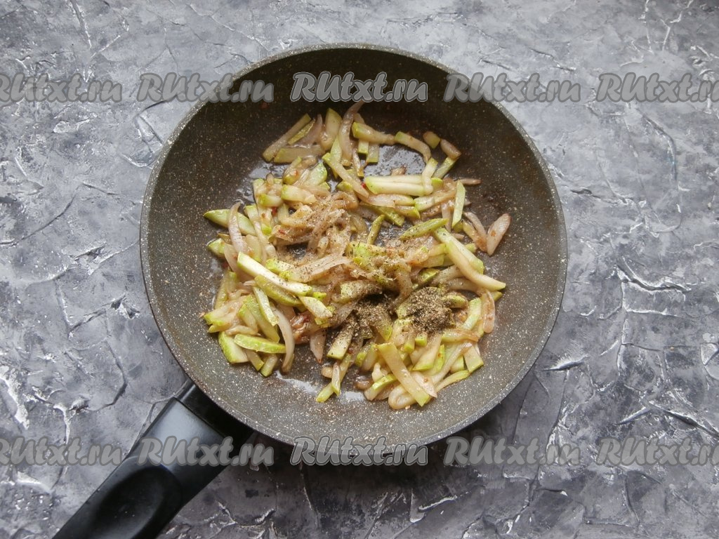 Перемешать и обжарить ещё около 3-4 минут. Всыпать сушёные французские травы, кабачки перемешать и выключить огонь. Дать кабачкам остыть.