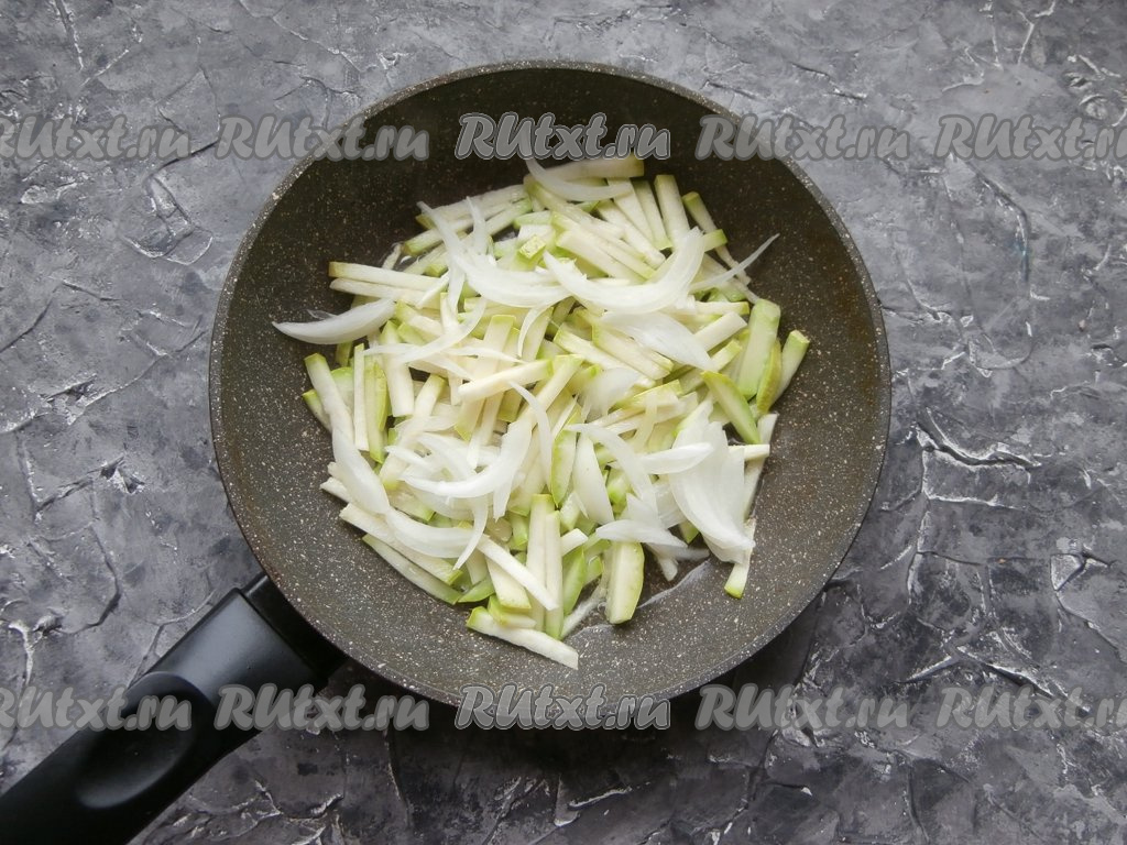 В сковороду влить растительное масло, разогреть, выложить кабачок, а также очищенный и нарезанный тонкими перьями репчатый лук.
