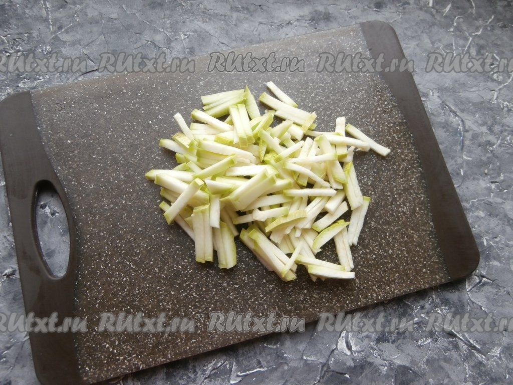 Молодой кабачок хорошо промыть, обсушить и нарезать брусочками. Я с кабачка шкурку не снимала.