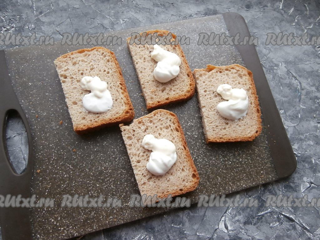 Ломти хлеба смазать майонезом (или смесью из майонеза и сметаны).