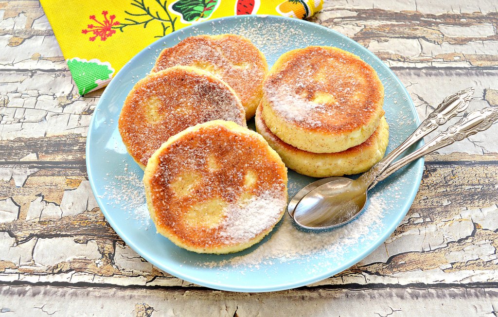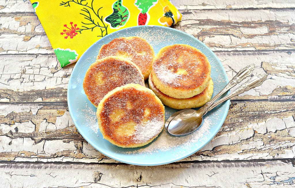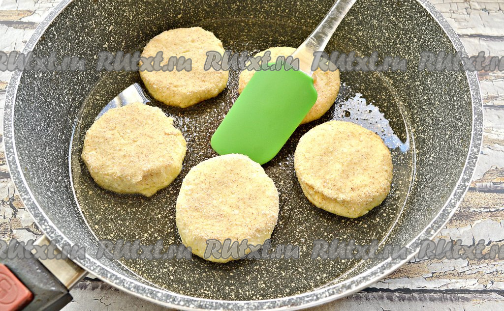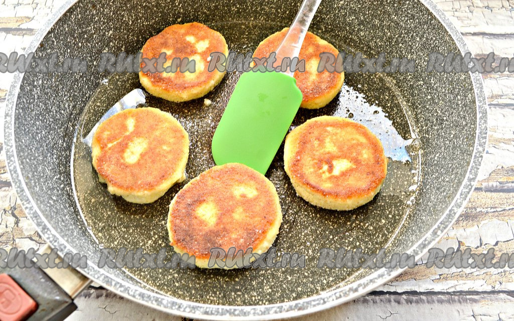 Жарить сырники с кукурузной мукой с каждой стороны на умеренном огне до слегка румяной корочки (на обжаривание сырников с двух сторон у меня ушло около 3 минут).