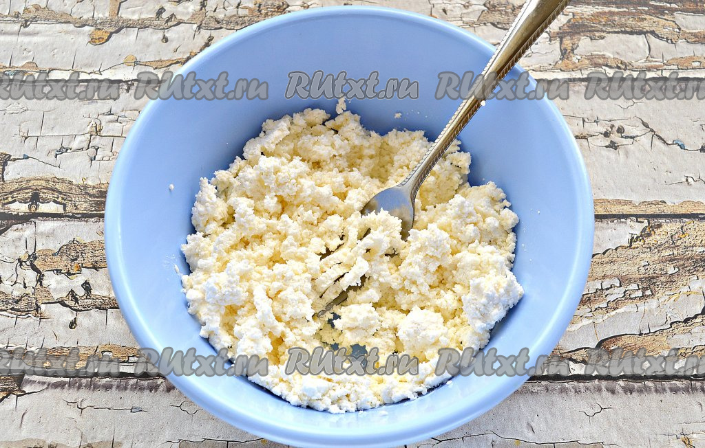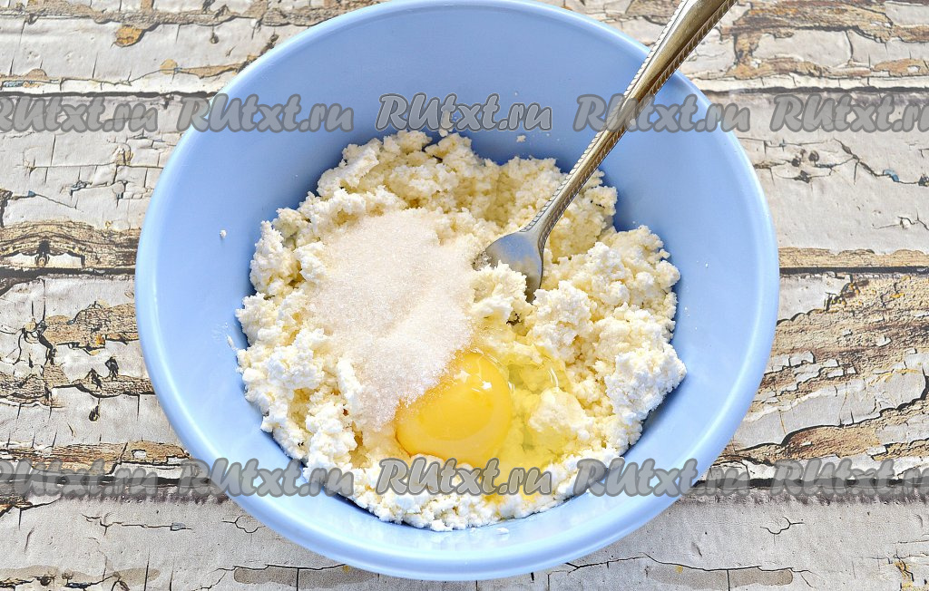Всыпать в творог сахар, добавить яйцо. Кстати, количество сахара можно уменьшить или увеличить, в зависимости от ваших вкусовых предпочтений.