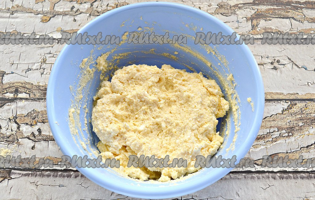 В получившуюся массу всыпать кукурузную муку и разрыхлитель для теста.