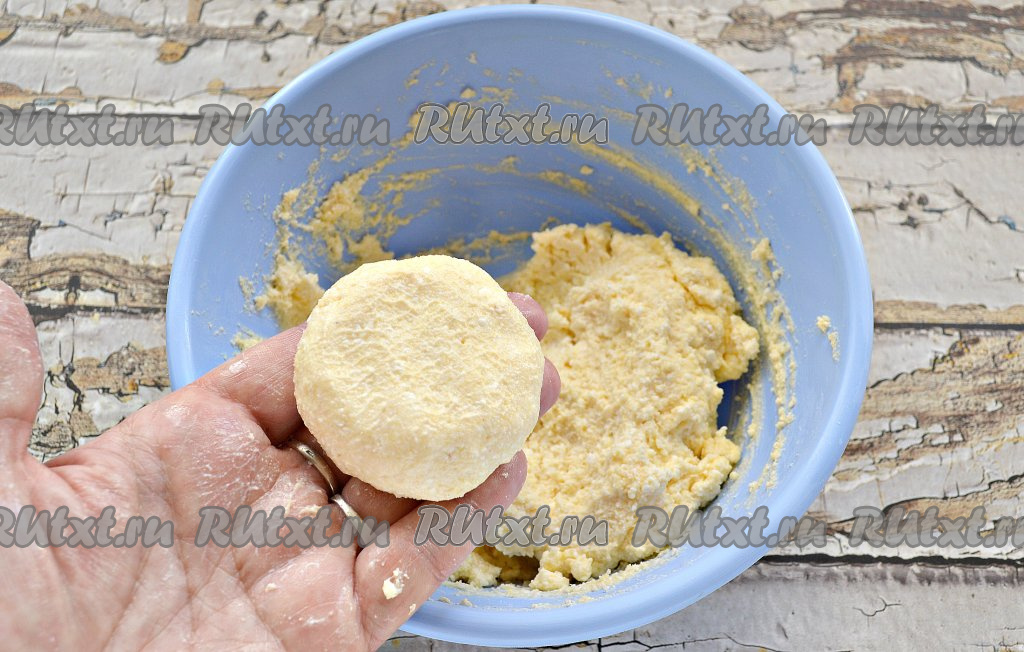 Перемешать ингредиенты до получения вязкого, липкого теста (как на фото). При необходимости, всыпьте ещё немного муки. Но помните, если вы добавите слишком много муки, готовые сырники не получатся мягкими и нежными.
