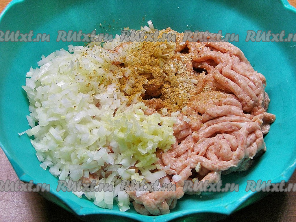 Перекладываем лук к мясному фаршу, добавляем измельчённый чеснок, солим, по желанию, можно добавить молотый чёрный перец и немного приправы на свой вкус. Тщательно перемешиваем фарш.