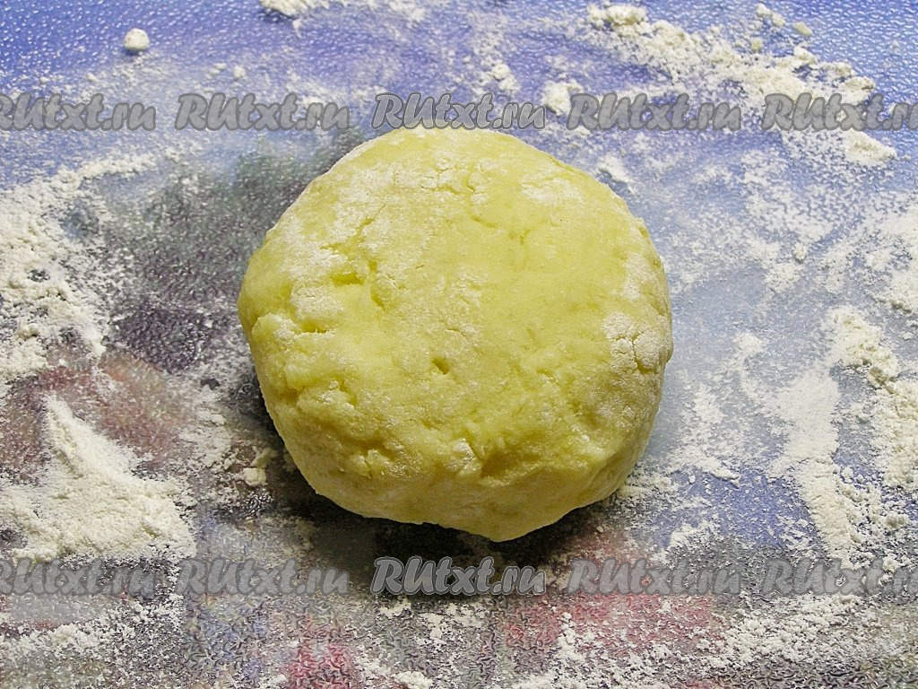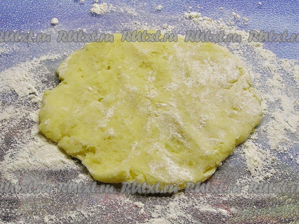 Разделяем плотное картофельное пюре на желаемое количество порций (у меня получилось 10 штук). Каждую часть пюре тонко раскатываем на доске, присыпав её мукой.
