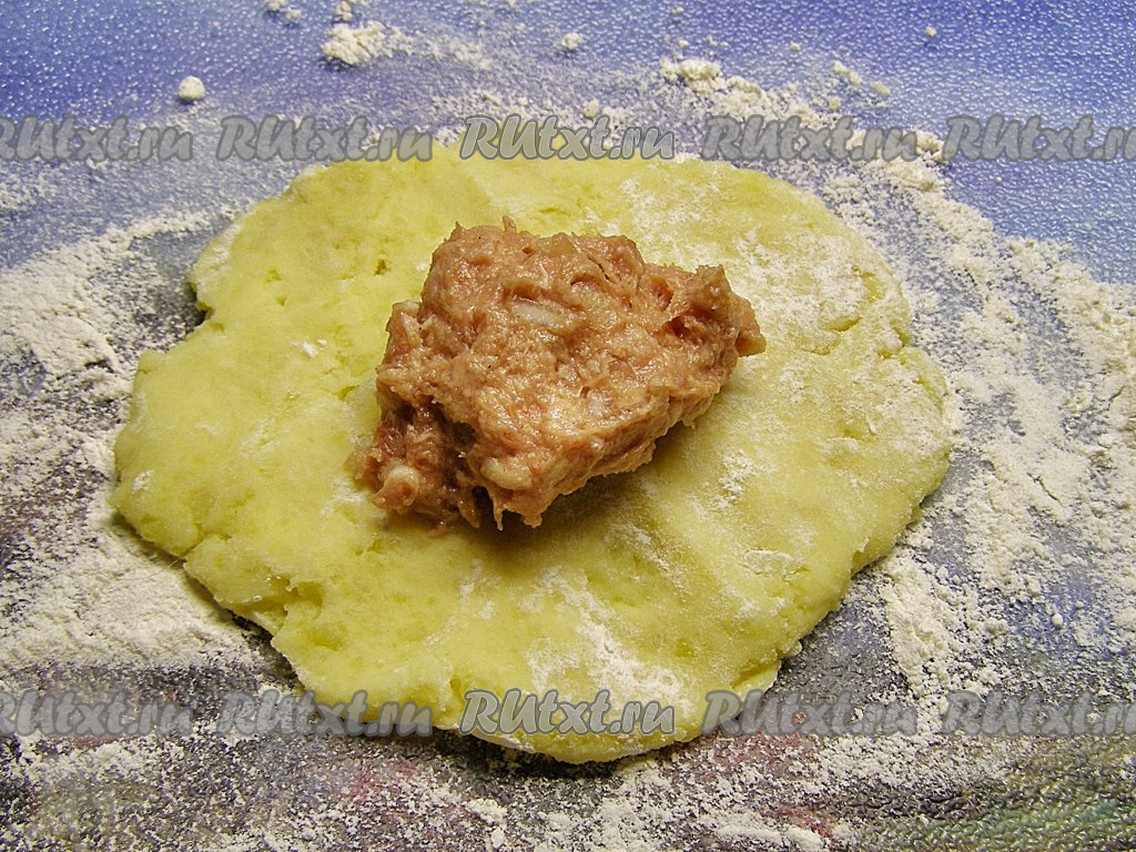 В середину картофельной лепёшки выкладываем фарш (примерно, 1 столовую ложку с горочкой).