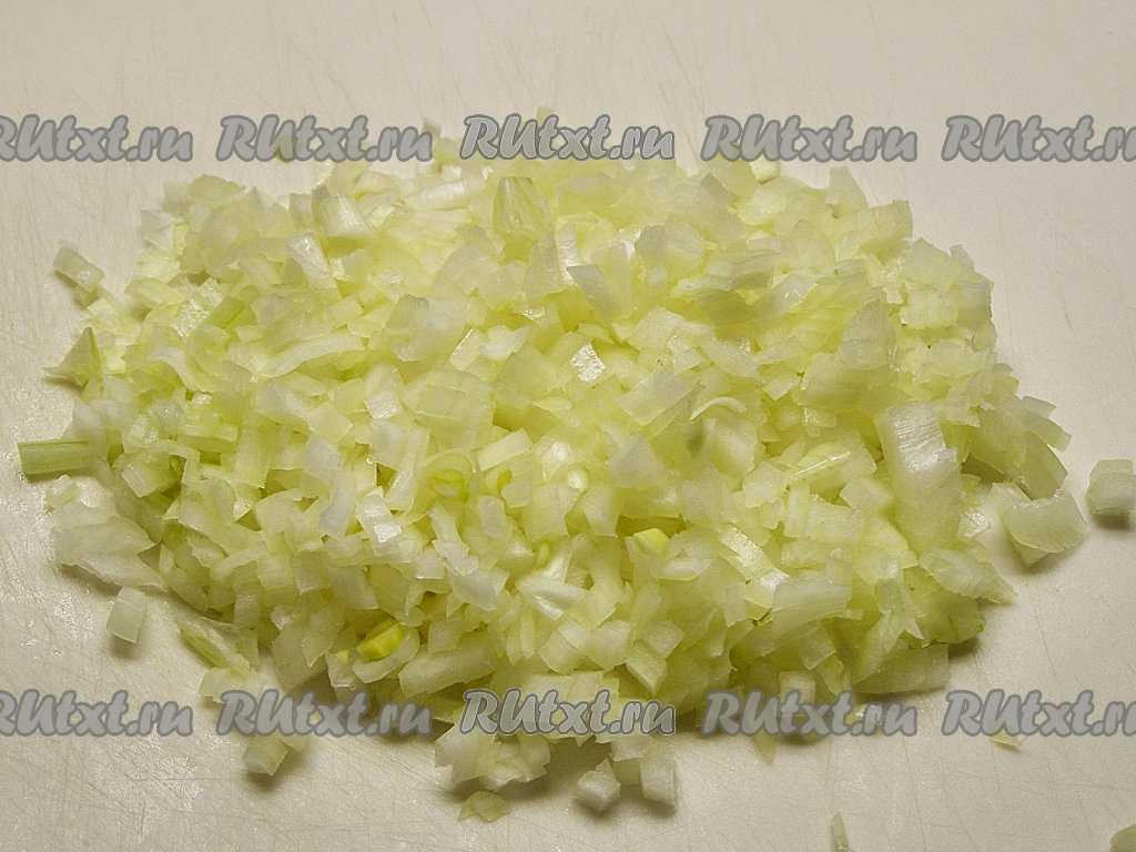 Пока пюре остывает, приготовим начинку. Луковицу чистим от шелухи и нарезаем на мелкие кубики.