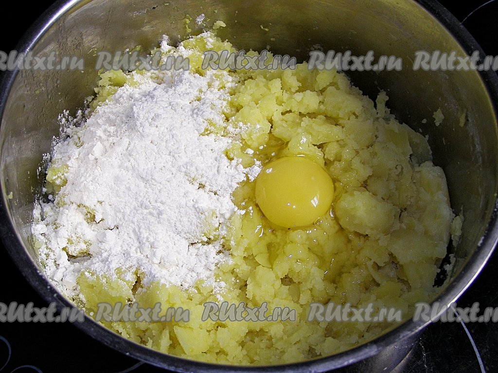 В остывшее картофельное пюре добавляем яйцо, муку и хорошо размешиваем. Пюре должно получиться, как плотное тесто и не должно прилипать к рукам. Если картофельное тесто получается липким, можно добавить ещё немного муки.