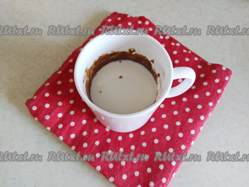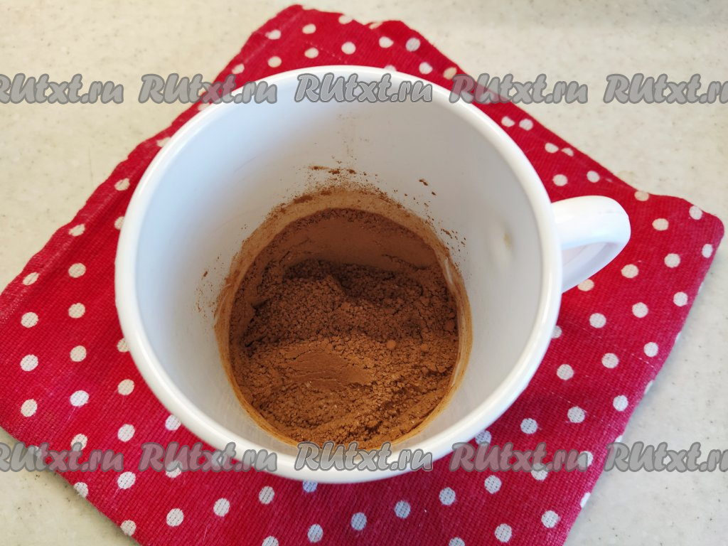 Возьмём кружку, пригодную для СВЧ-печи. Все ингредиенты перемешиваем прямо в кружке в определённой последовательности. Сначала смешиваем сахар и какао.