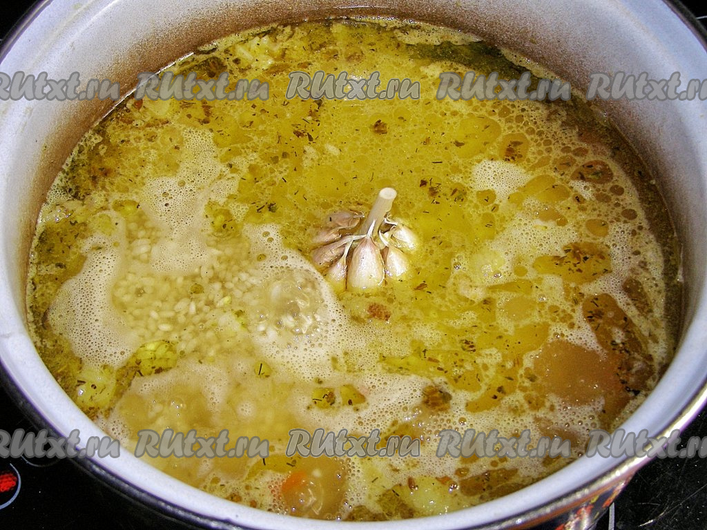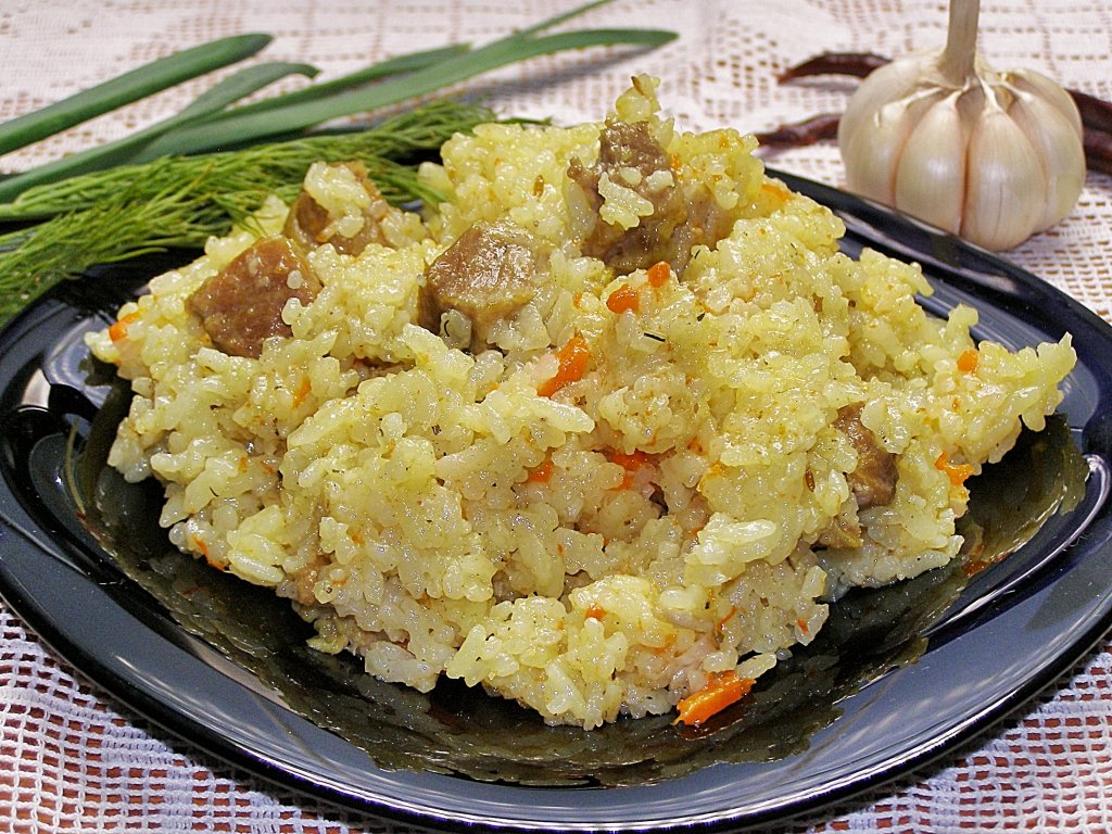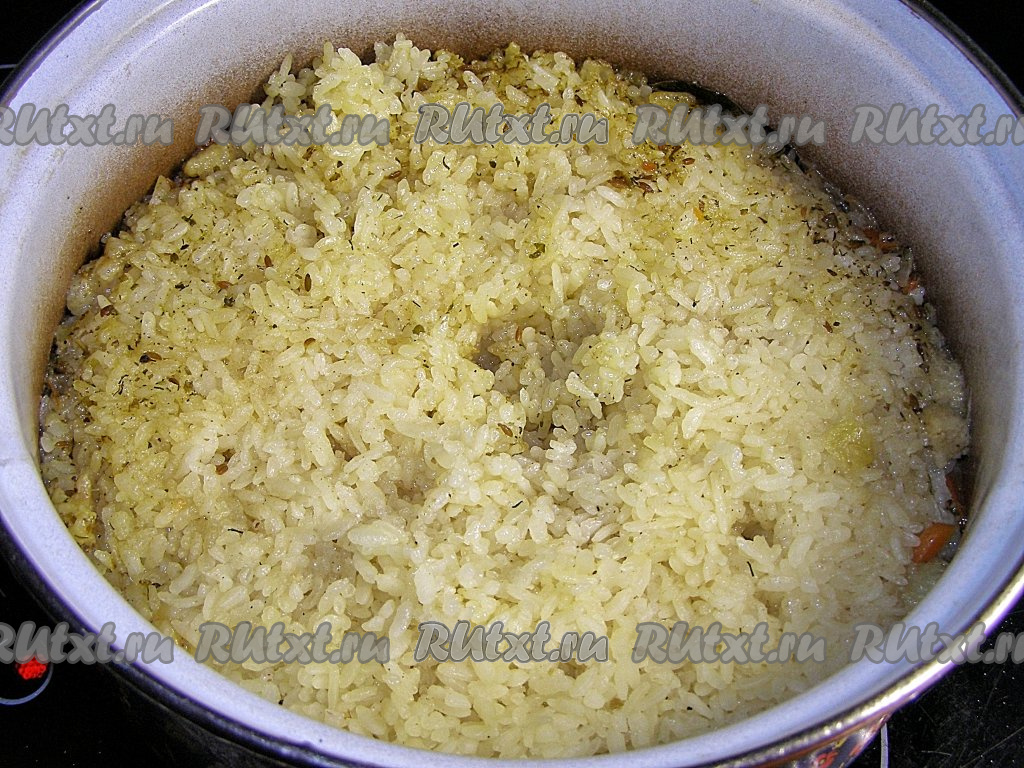 Когда свинина с овощами проварится минут 20, сливаем с замоченного риса воду и перекладываем его в кастрюлю с зирваком. Перед тем как положить рис, не забудьте достать из кастрюли лавровый лист. Ложкой разравниваем рис, в середину кастрюли кладём головку чеснока и заливаем горячую кипячёную воду на 3-4 см выше уровня риса.