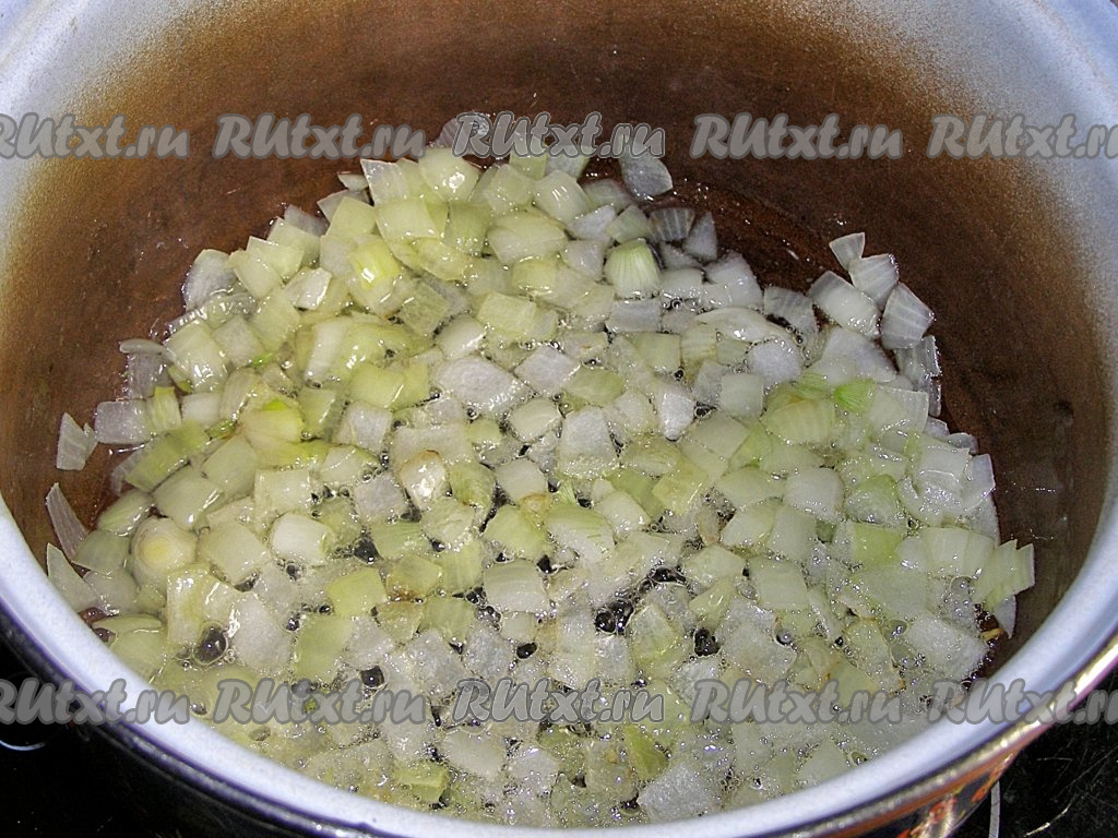 В кастрюлю с толстым дном (или с антипригарным покрытием) наливаем подсолнечное масло, разогреваем его на сильном огне и выкладываем нарезанный лук. Обжариваем на среднем огне, помешивая, примерно, 3-4 минуты (лук должен приобрести лёгкий золотистый оттенок).