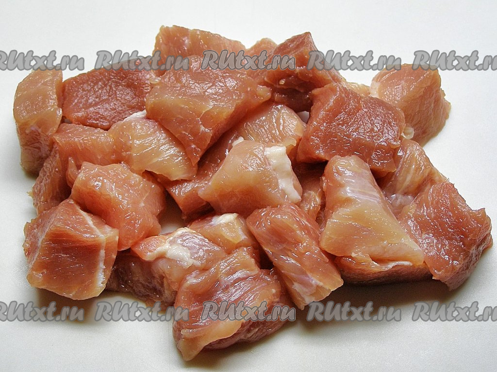 Займёмся приготовлением зирвака, для этого свинину споласкиваем прохладной водой, просушиваем бумажными салфетками и нарезаем на кубики размером 2х2 см.