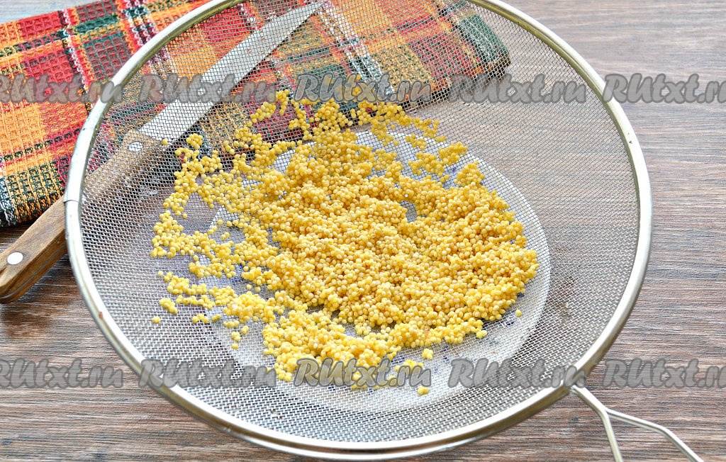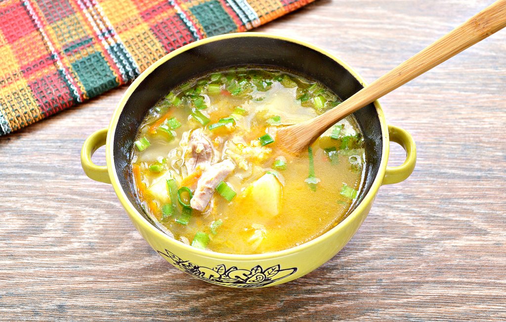 Перебрать пшено, удалить чёрные зернышки. Выложить пшено в сито и промыть крупу холодной водой, дать слиться лишней жидкости. Добавить пшено в кастрюлю к щам, перемешать, дать закипеть и варить далее на небольшом огне минут 10.