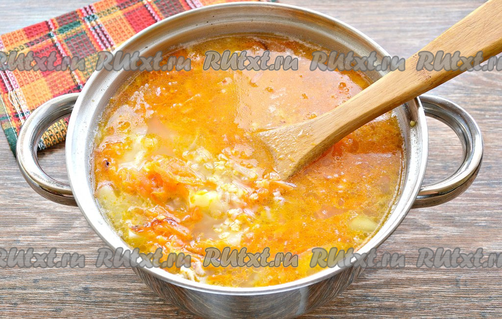 Когда пшено проварится минут 10, добавить в щи обжаренные овощи, лавровый лист, дать блюду закипеть и, убавив огонь, варить 7 минут.