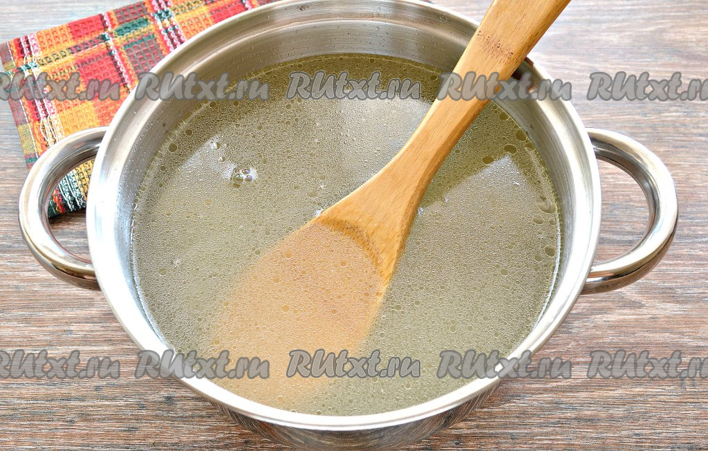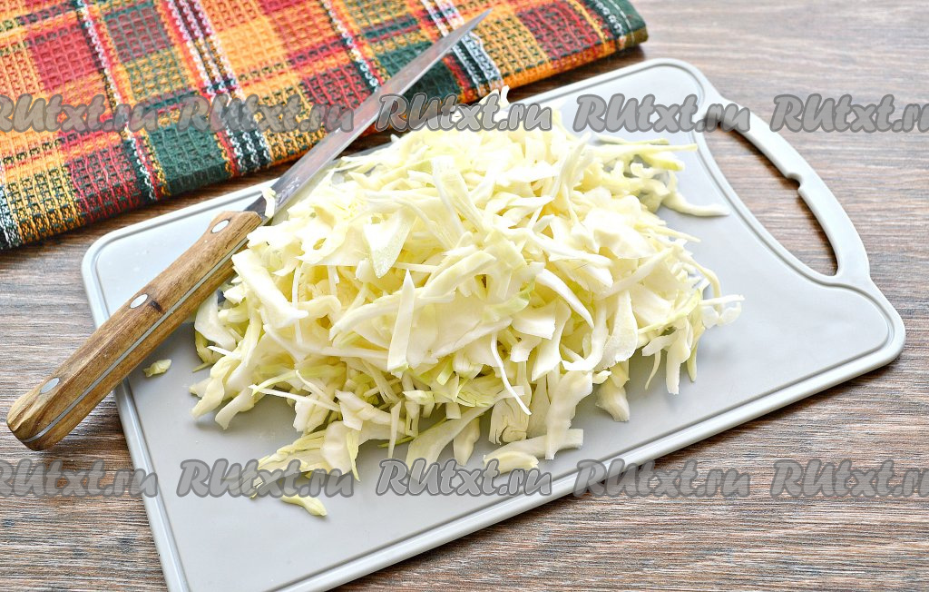 Со свежей капусты удалить верхние повреждённые листья. Капусту промыть водой и тонко нашинковать. Поместить нарезанную капусту в закипевший бульон. После закипания убавить огонь и варить 10 минут.