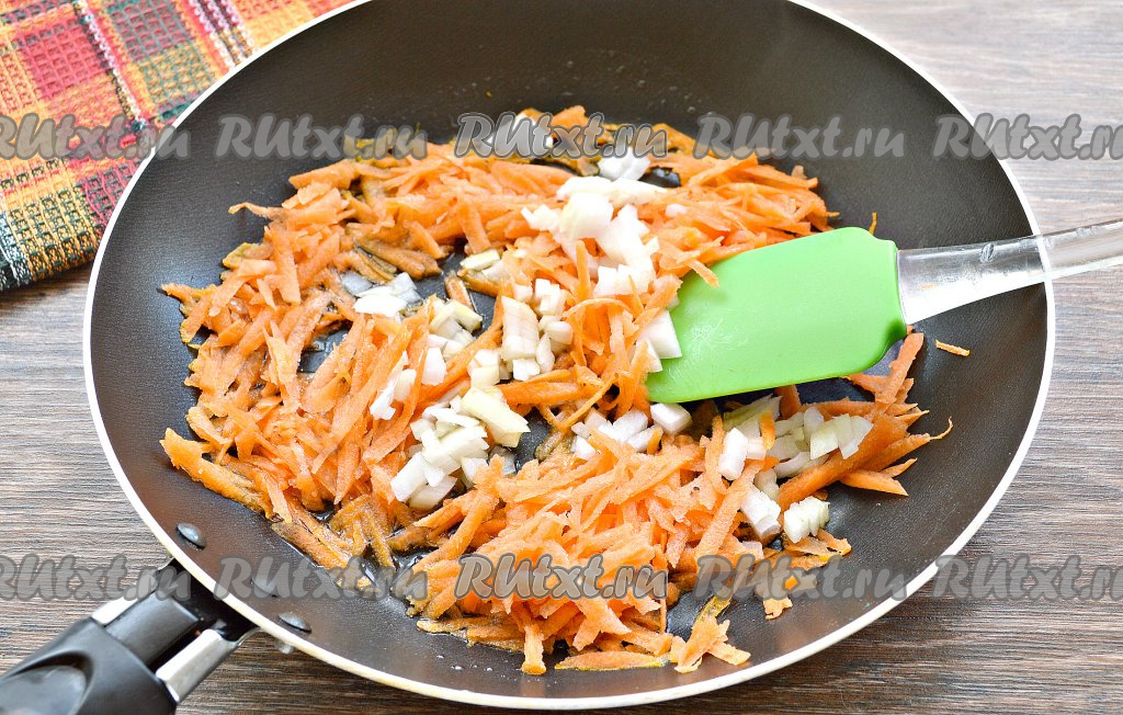 Пока варятся щи с пшеном, приготовим овощную зажарку. Для этого в хорошо разогретую с растительным маслом сковороду нужно выложить очищенную и мелко нарезанную луковицу, добавить небольшую очищенную и натёртую морковку, обжарить овощи на среднем огне 5 минут, периодически перемешивая.
