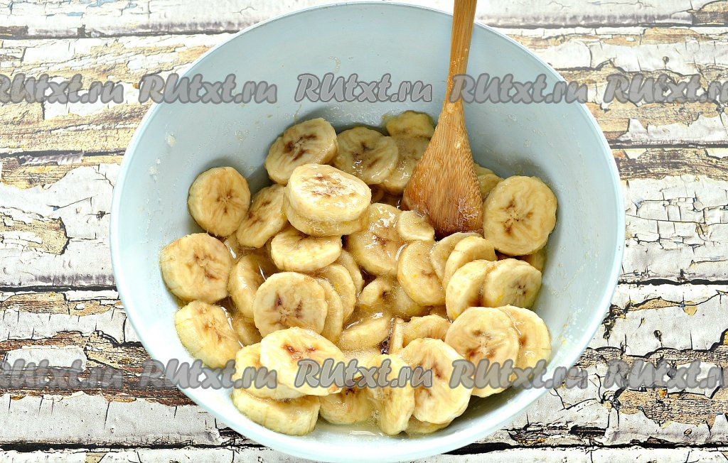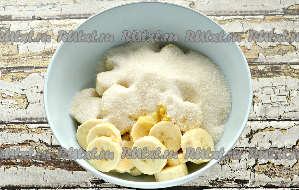 Оставить бананы в сахаре при комнатной температуре на 1 час. За это время пару раз перемешать содержимое миски. Кристаллики сахара должны раствориться.