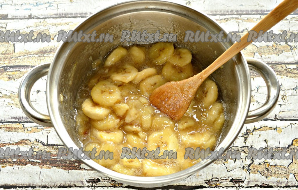 Бананы переложить в кастрюлю (лучше всего подойдёт кастрюля с толстым дном или с антипригарным покрытием), поставить на средний огонь. Дождаться закипания, убавить огонь и проварить банановое варенье 10 минут, периодически перемешивая.